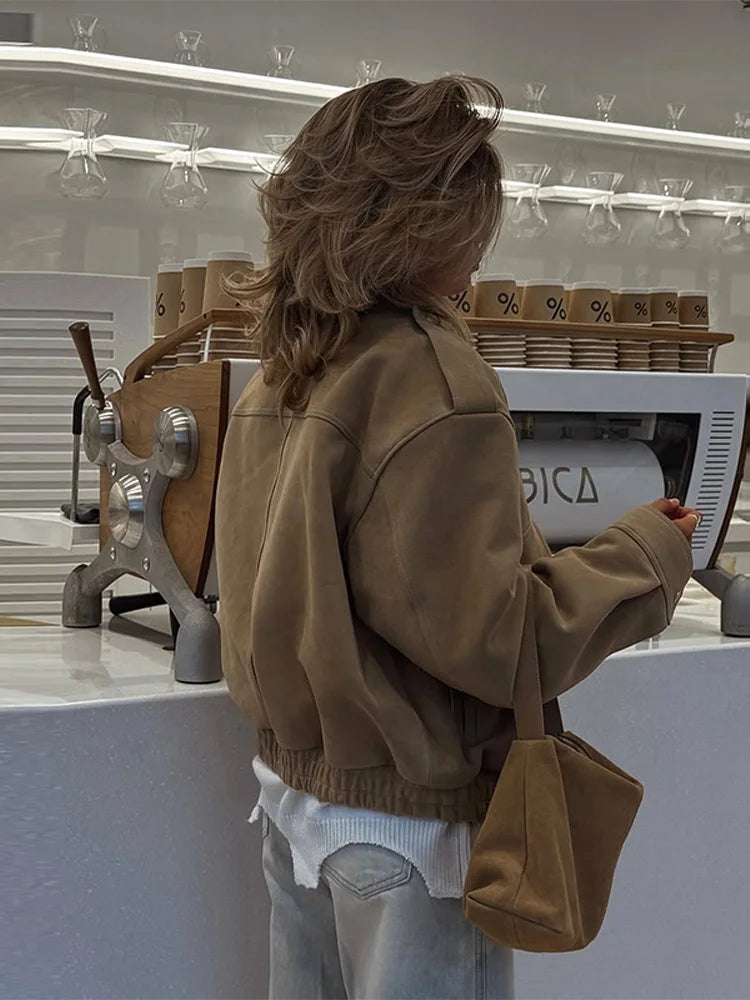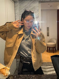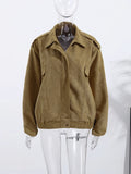 Suede Long Sleeve Bomber Jacket Women Street Turn-down Collar Epaulet Long Sleeve Ruched Loose Autumn Winter Coats New Outerwear