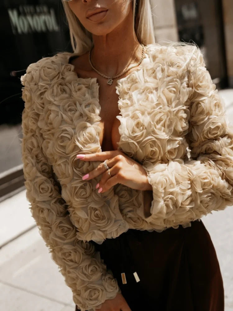 Texture Flower Short Jacket Coats Women Fashion O-neck Long Sleeve 3D Flower All-match Short Tops New Chic Office Lady Outerwear