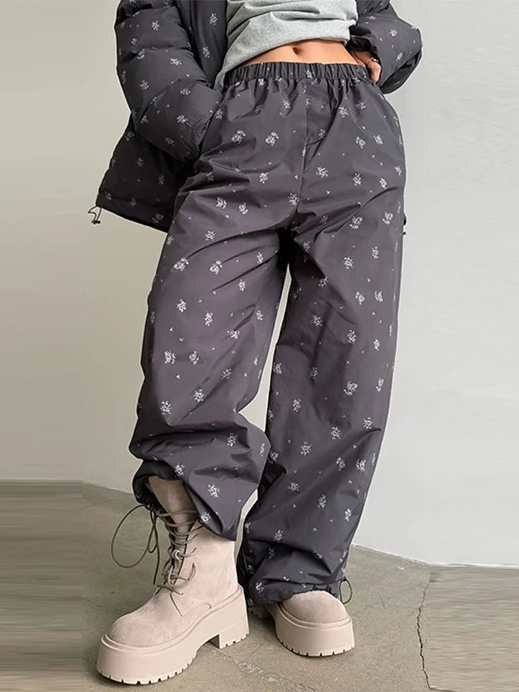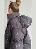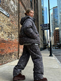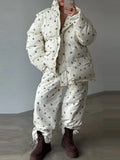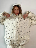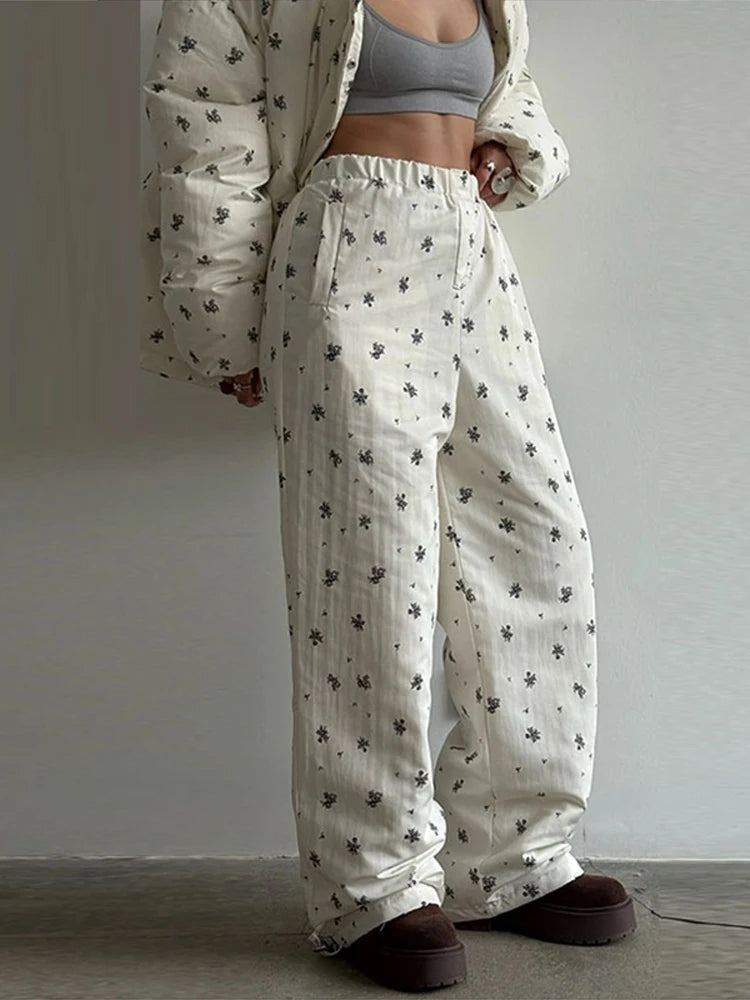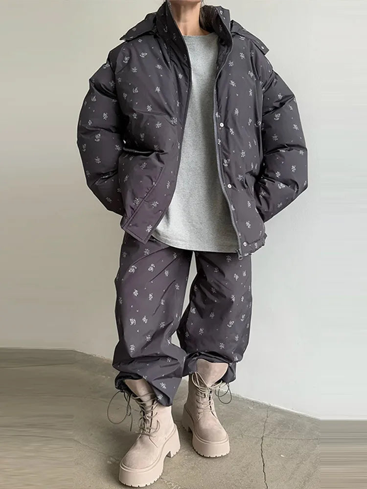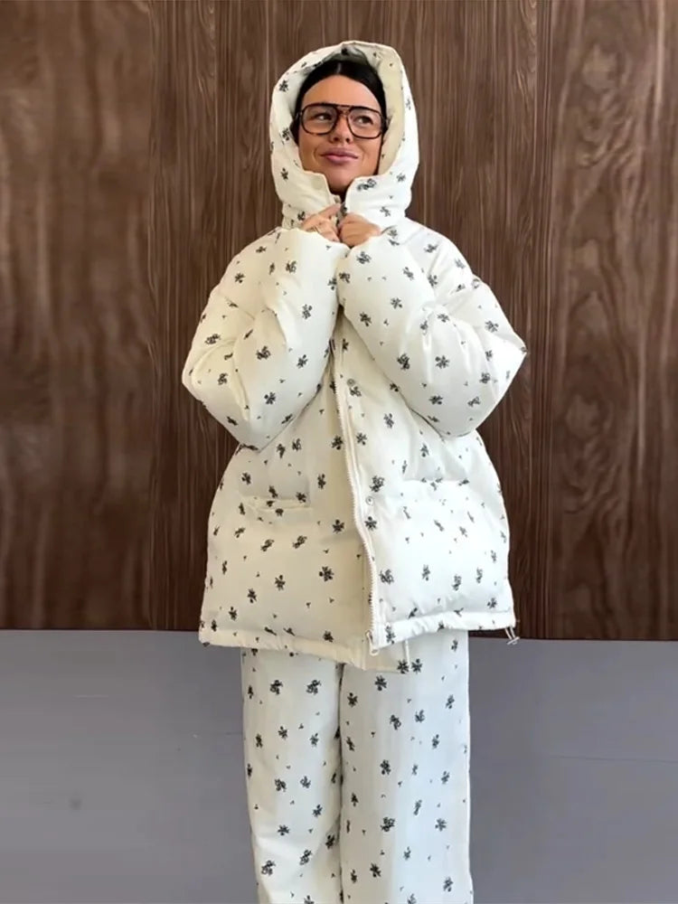 Women's 2 Pcs Suits Hooded Printed Padded Jacket Pants Sets New Winter Loose Bomber Coats Elastic Waist Trousers New Lady Outfit