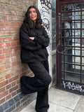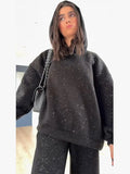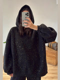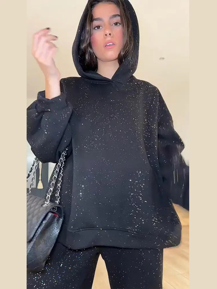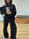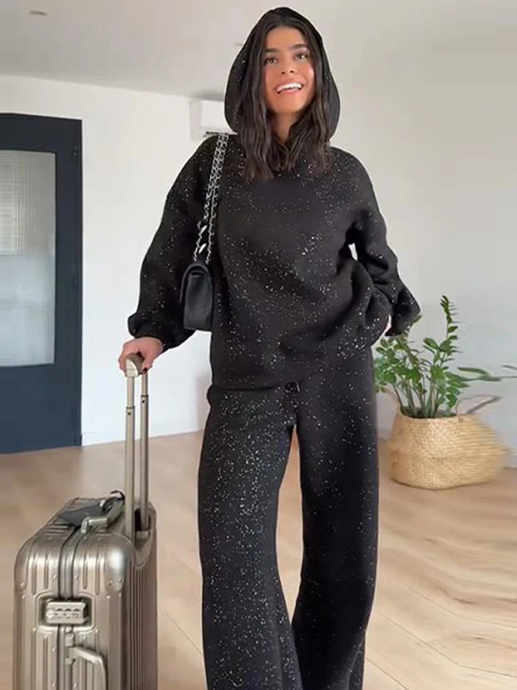 Women's 2 Pcs Suits Sparkly Hoodie Pants Sets Casual Female Hooded Lantern Sleeve Loose Tops Wide Leg Trousers Chic Lady Outfits