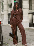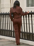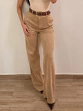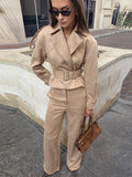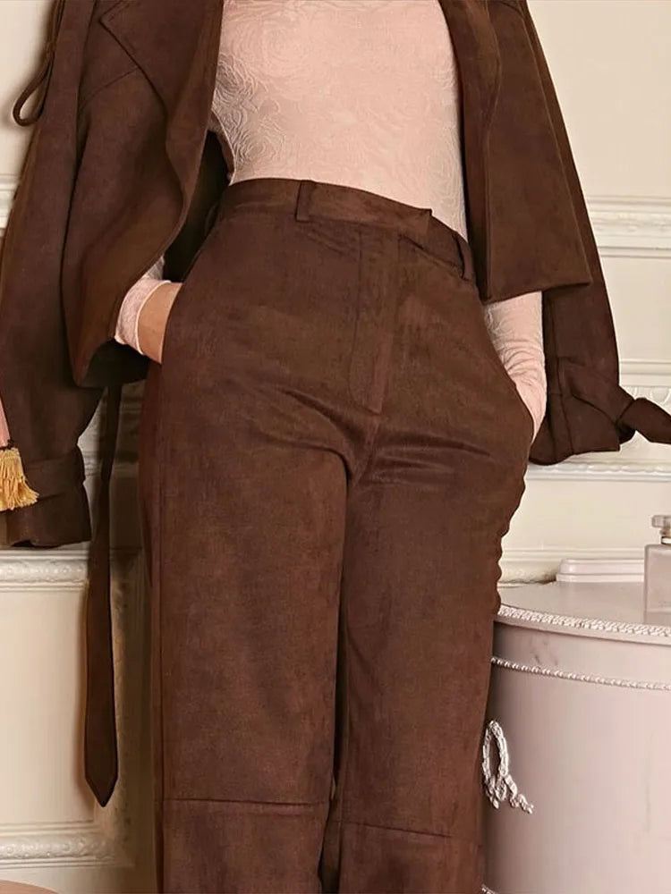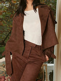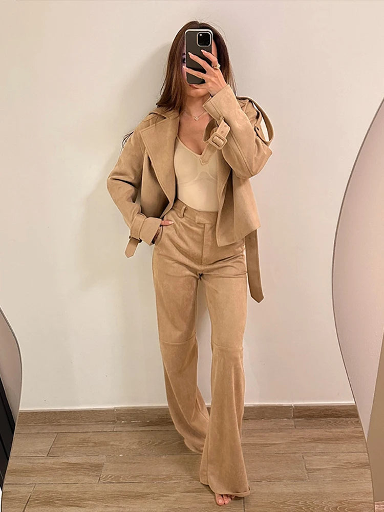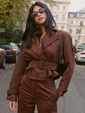 Women's 2 Pcs Suits Suede Lapel Sashes Short Jacket Pants Sets Chic Female Full Sleeves Slim Coats High Waist Trousers Partywear
