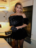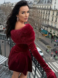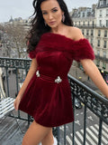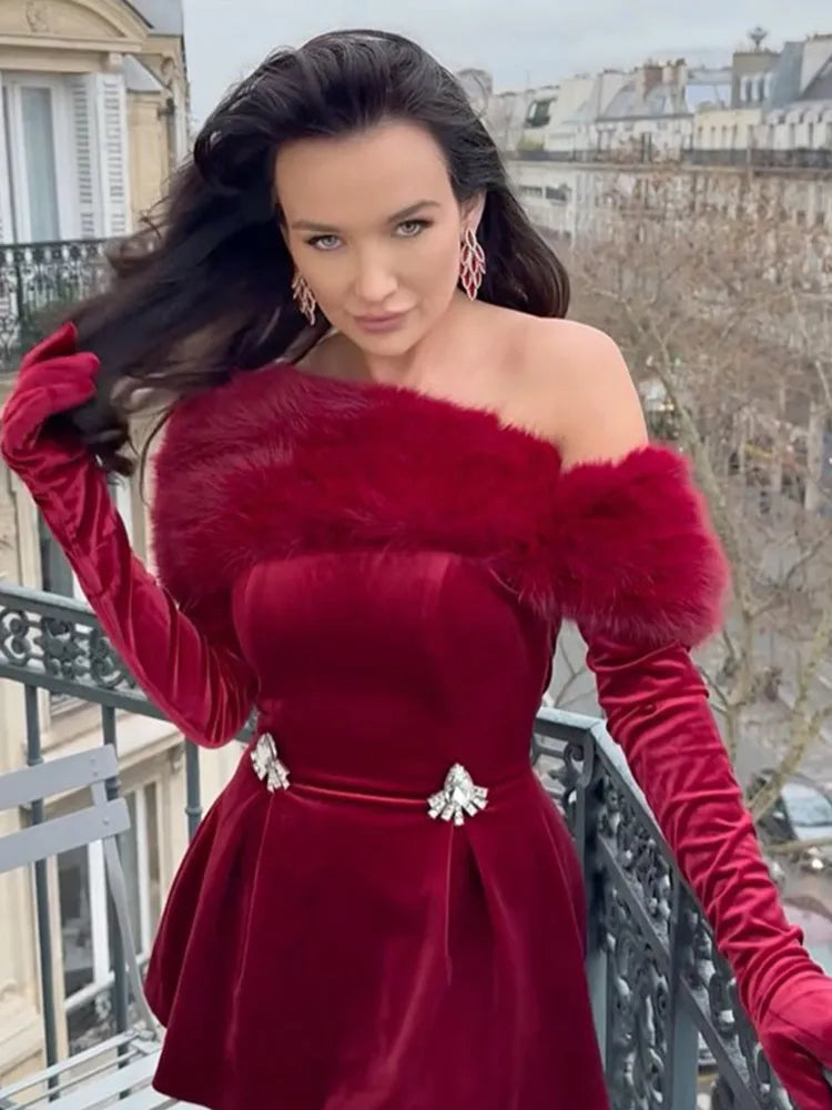 Women's Evening Dresses Feather Patchwork Arm Sleeves Rhinestone Robes Autumn 2025 Female Slash Neck Slim Dress Luxury Partywear