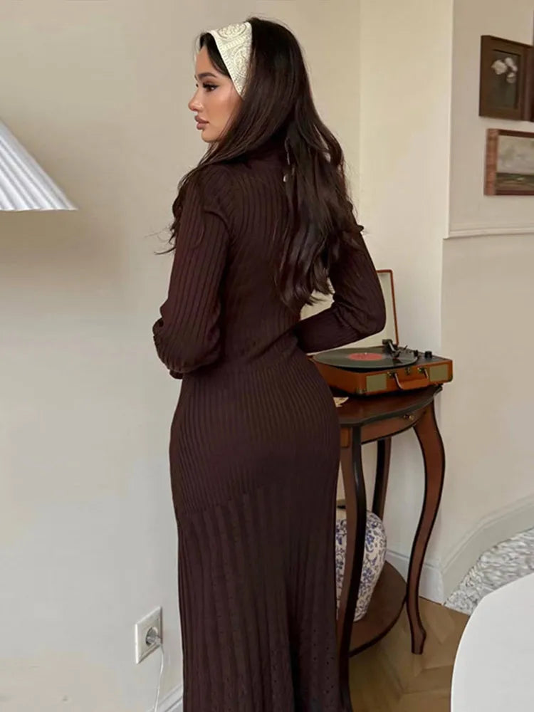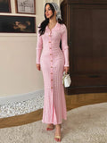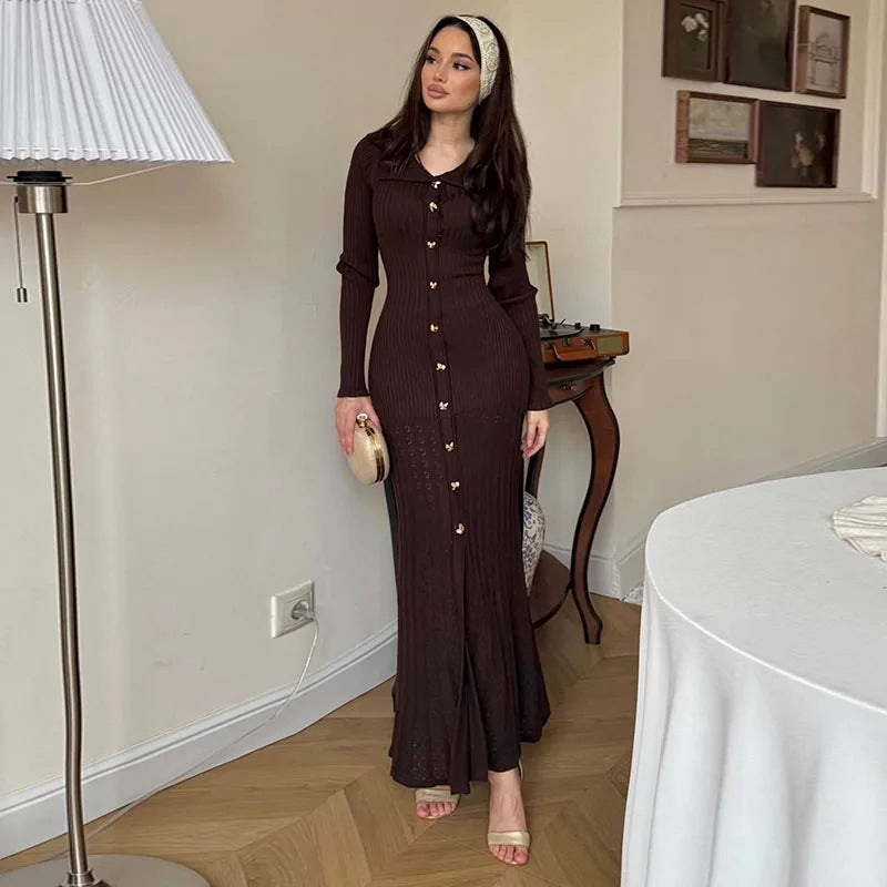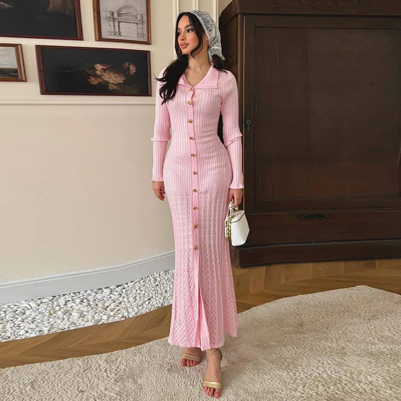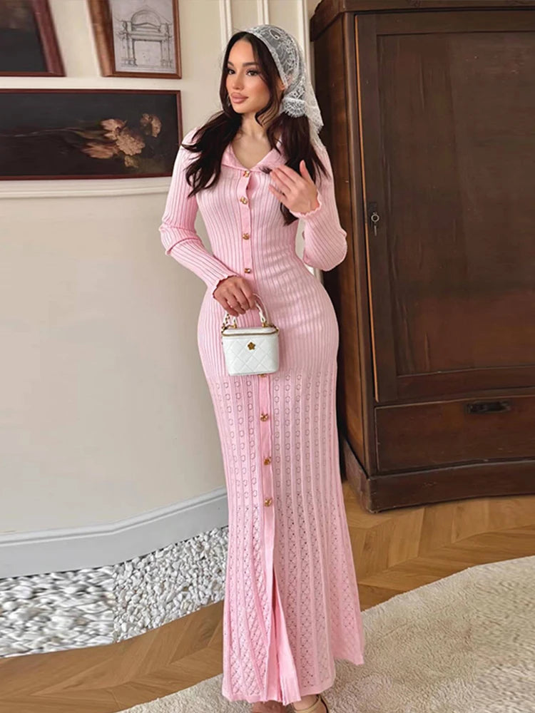 Women's Evening Dresses Lapel Button Knitted Long Dress Early Spring Female Full Sleeve Single Breasted Slim Partywear Clubwear