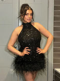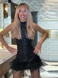 Women's Evening Dresses Sequined Feather Patchwork Party Short Dress Sexy Female Sleeveless Backless Slim Partywear Clubwear New