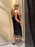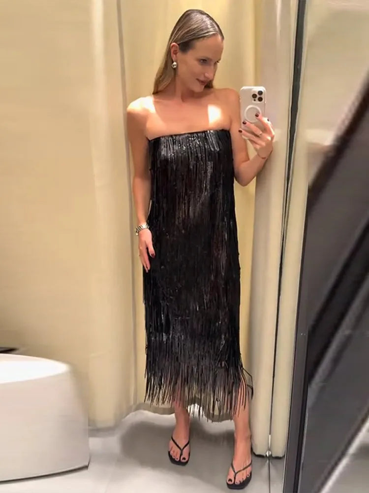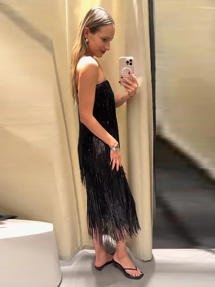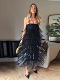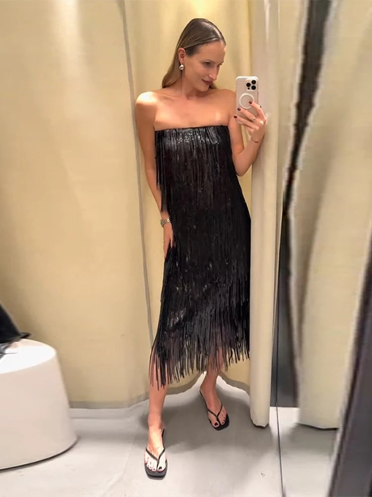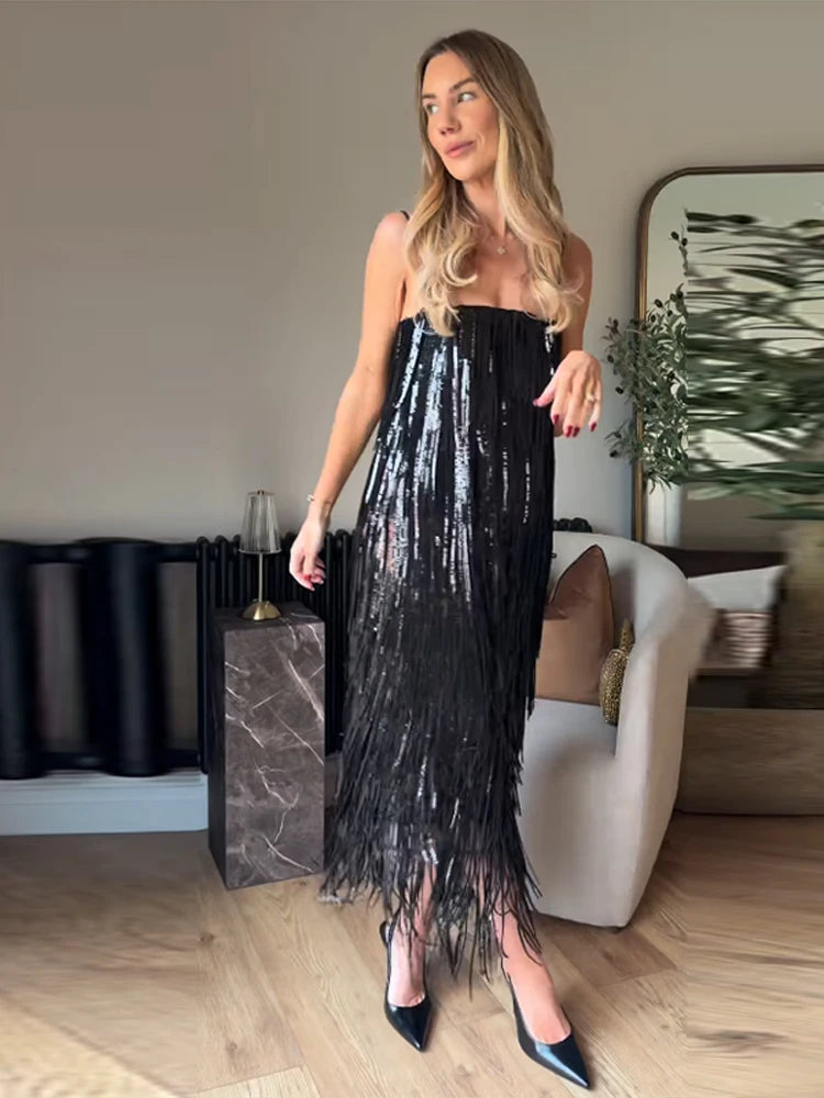 Women's Evening Dresses Sequined Tassels Strapless Midi Dress Glitter Female Sleeveless Backless Partywear New Ladies Beachwear