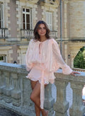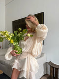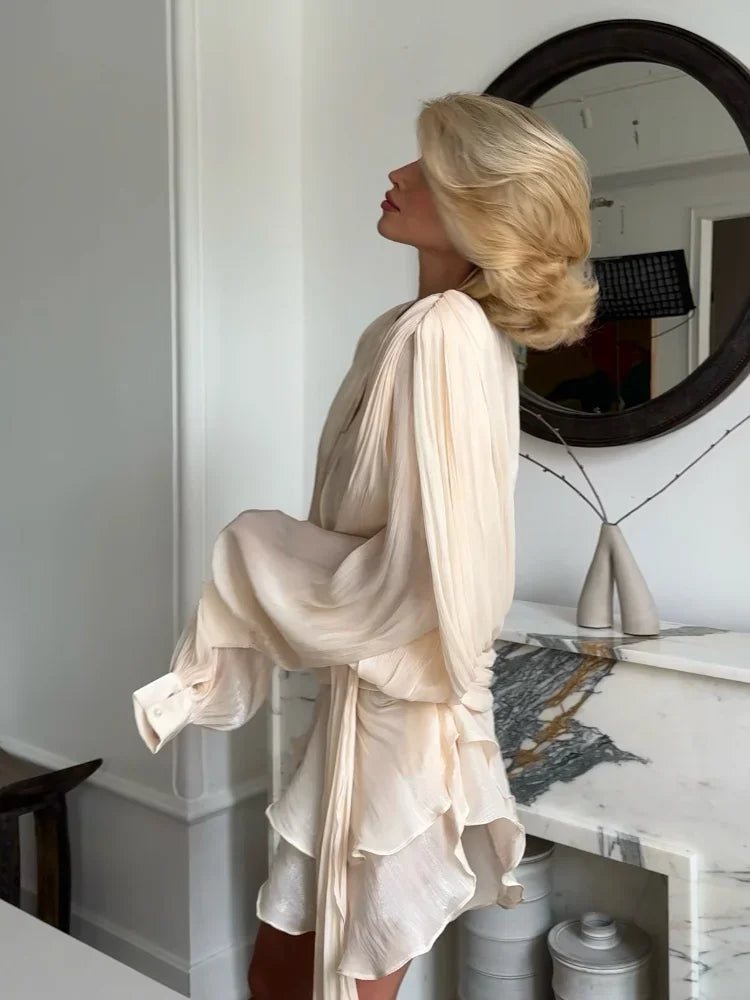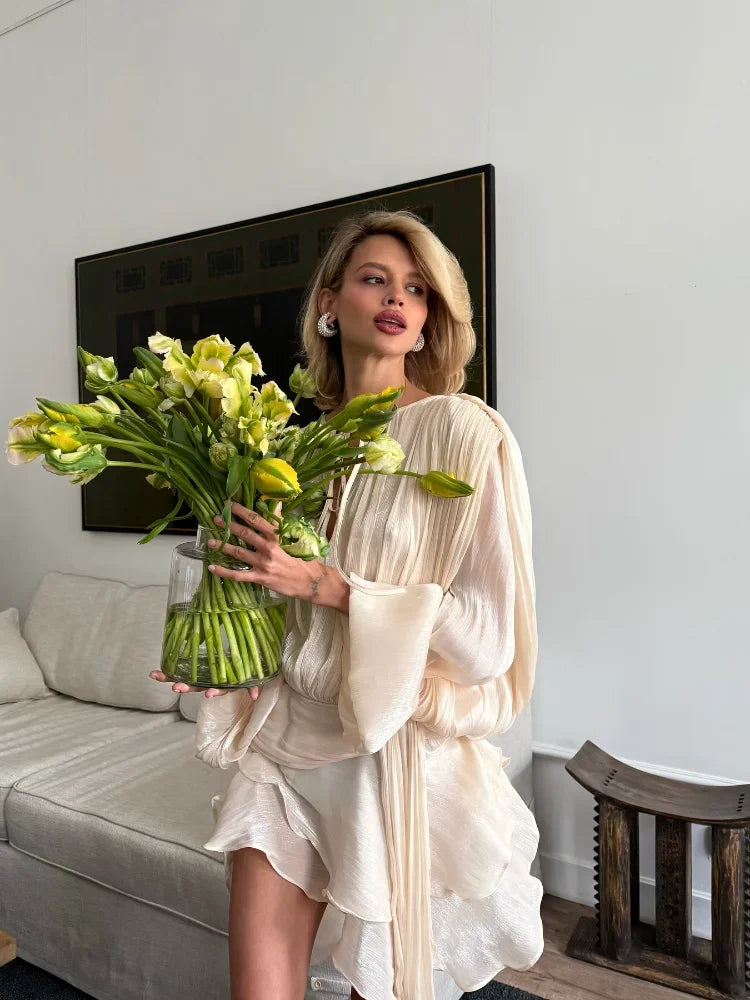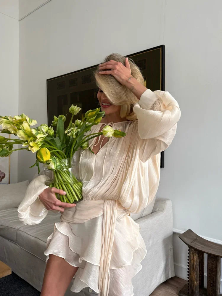 Women's Ruffles Shiny Mini Dress Elegant Solid Lantern Sleeve Lace Up Pleated Dresses Summer Chic Lady Party Vestidos 2025 New