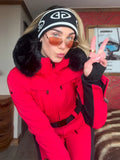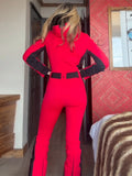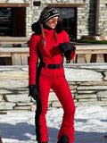 Women's Ski Suits Panelled Hooded With Belt Skiwear Sporty Female Stand Collar Slim One-piece Winter Warm Sportwear New Bodysuit