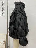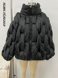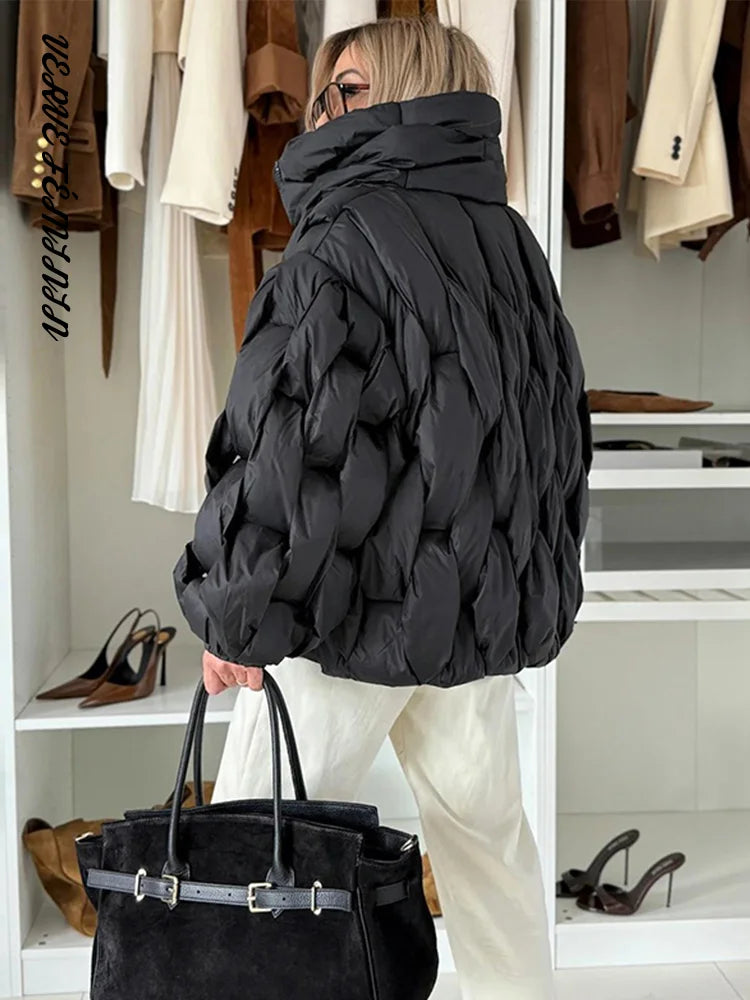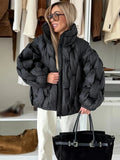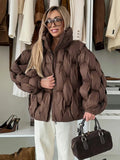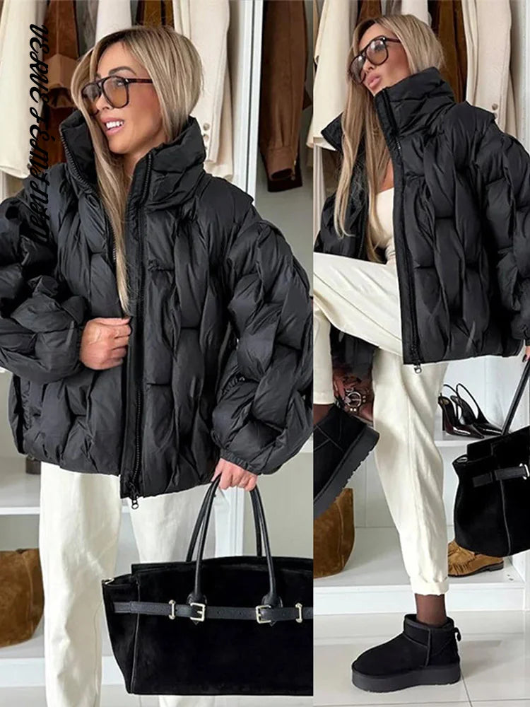 Women's Winter Coats Stand Collar Full Sleeve Argyle Padded Jacket New Lantern Sleeves Zipper Loose Fitting Coat Chic Outerwears
